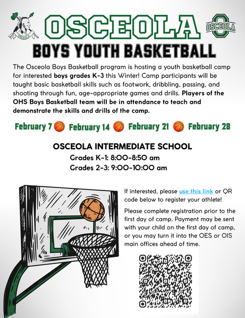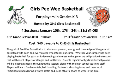 The Osceola Boys Basketball program is hosting a youth basketball camp for interested boys grades K-3 this Winter! Camp participants will be taught basic basket...